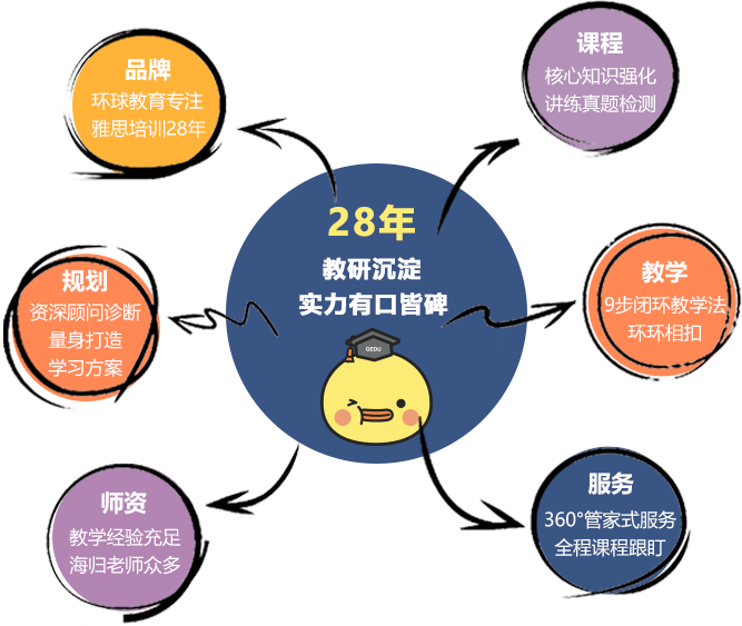 环球教育封闭学院是集教学、饮食、住宿,活动为一体的封闭式校区,讲师授课+早晚正课老师答疑+教练全程辅导+学管师跟踪管理+宿管管家式服务,高度关注每个学生,实现多重保障,免除外界干扰,是您学习雅思的不二选择。